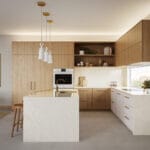 The classic-style structure of the cabinets blends in perfect harmony with the exposed wood of the island...