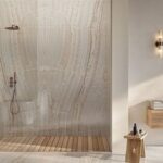 Wavy layers of warm white and translucent beige hues, accented by bright white highlights and golden rust deposits, create a sophisticated surface with organic veins that evoke a sense of natural movement.